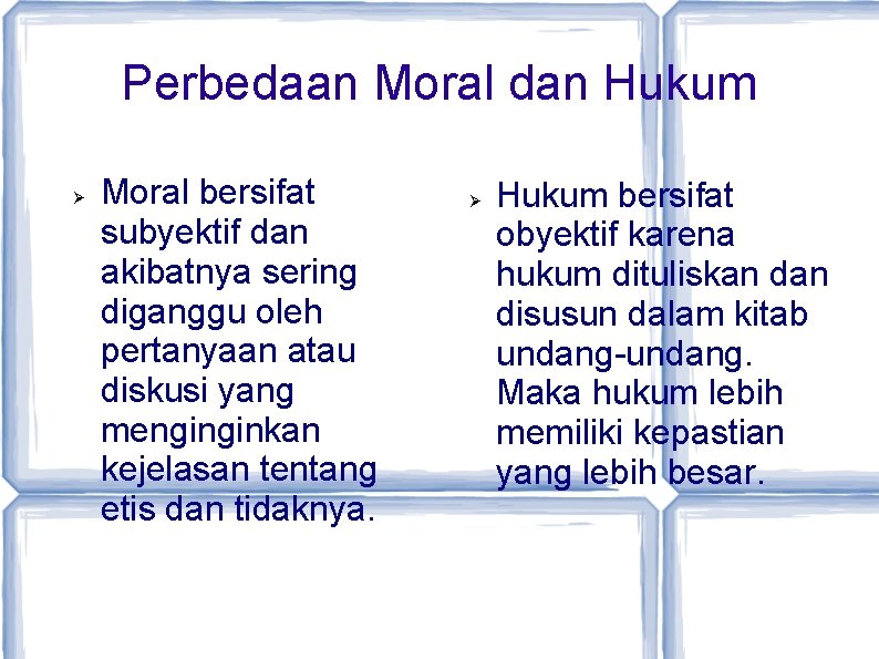 Contoh pertanyaan dan jawaban tentang hukum perdata pertanyaan tentang hukum perdata, 13 06 2019 contoh pertanyaan dan jawaban tentang hukum perdata posted by unknown at thursday 13 june 2019 1 pennundukan diri ada 4 macam jelaskan apa 4 macam tersebut 2 menurut pendapat saudar apakah peggoloongan penduduk yang di atur dalam pasal 131 is itu. Menurut velasquez (2005:10), etika merupakan ilmu yang mendalami standar moral perorangan dan standar moral masyarakat. Berikut ini tersedia beberapa artikel yang menjelaskan secara lengkap tentang pertanyaan tentang nilai moral dan akhlak. Karena ilmu,dengan berjalannya waktu serta berkembangnya zaman maka ilmu tidak akan berhenti dalam artian akan selalu berkembang. Perkembangan ini meliputi faktor perkembangan kecerdasan, moral dan emosional peserta didik.